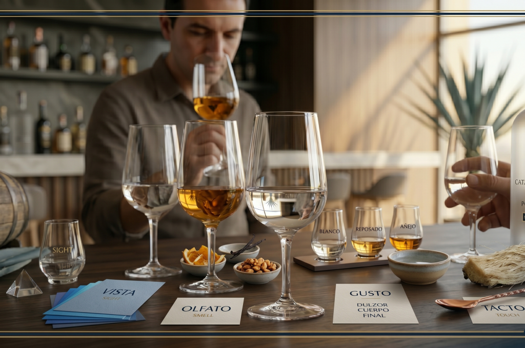 Todo análisis sensorial serio de un tequila pasa por cuatro dimensiones: vista, olfato, gusto y retrogusto. Cada una aporta información distinta y ninguna puede reemplazar a las otras. Saltarse alguna es como leer un libro desde la mitad: puedes entender algo, pero te pierdes el contexto que da sentido a todo.